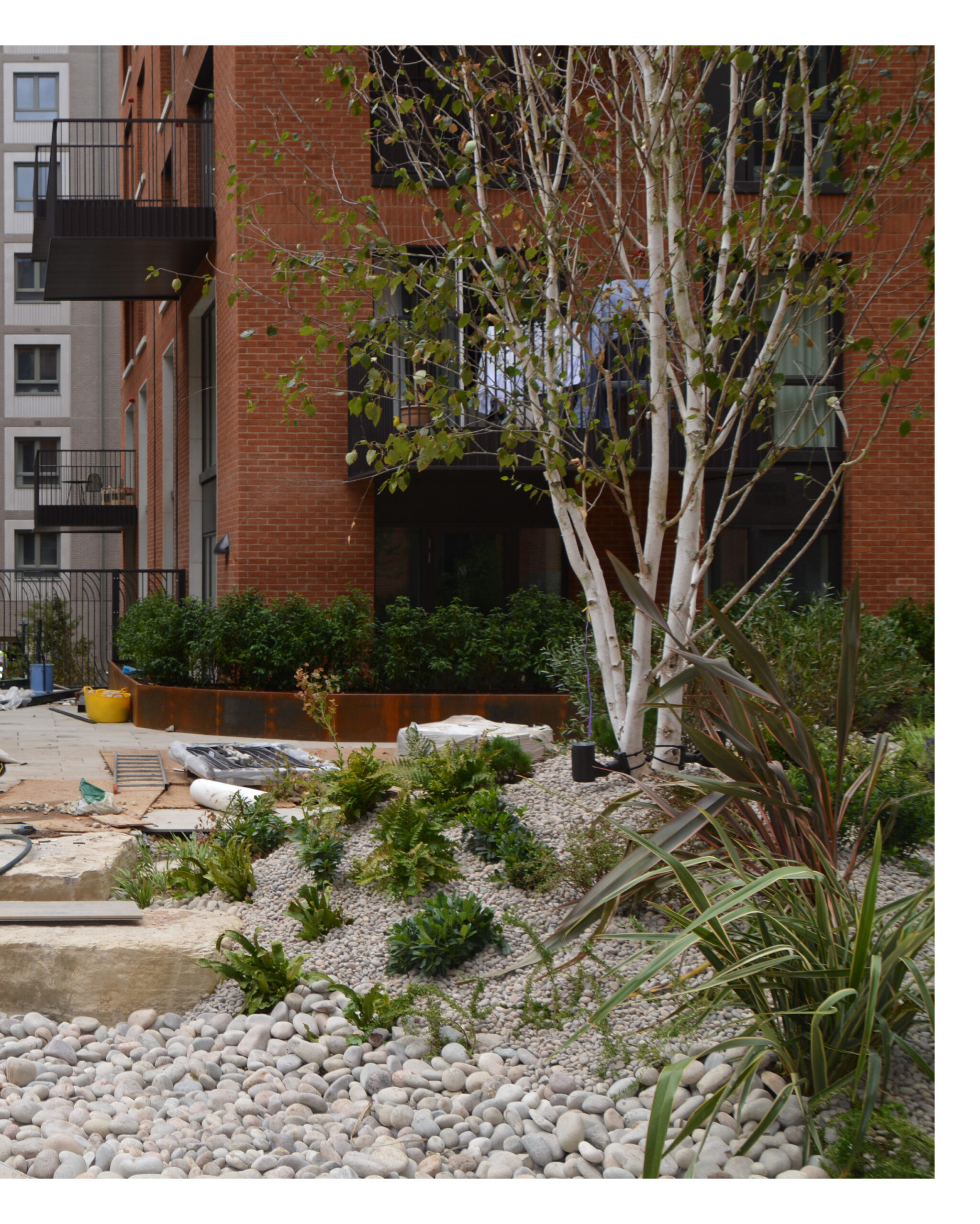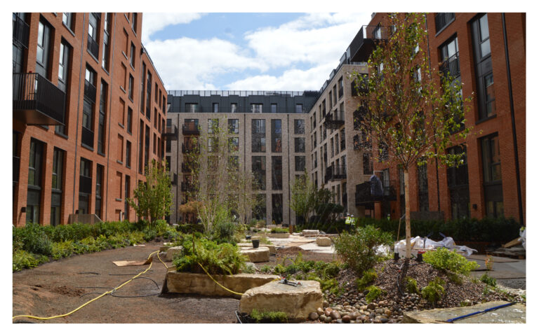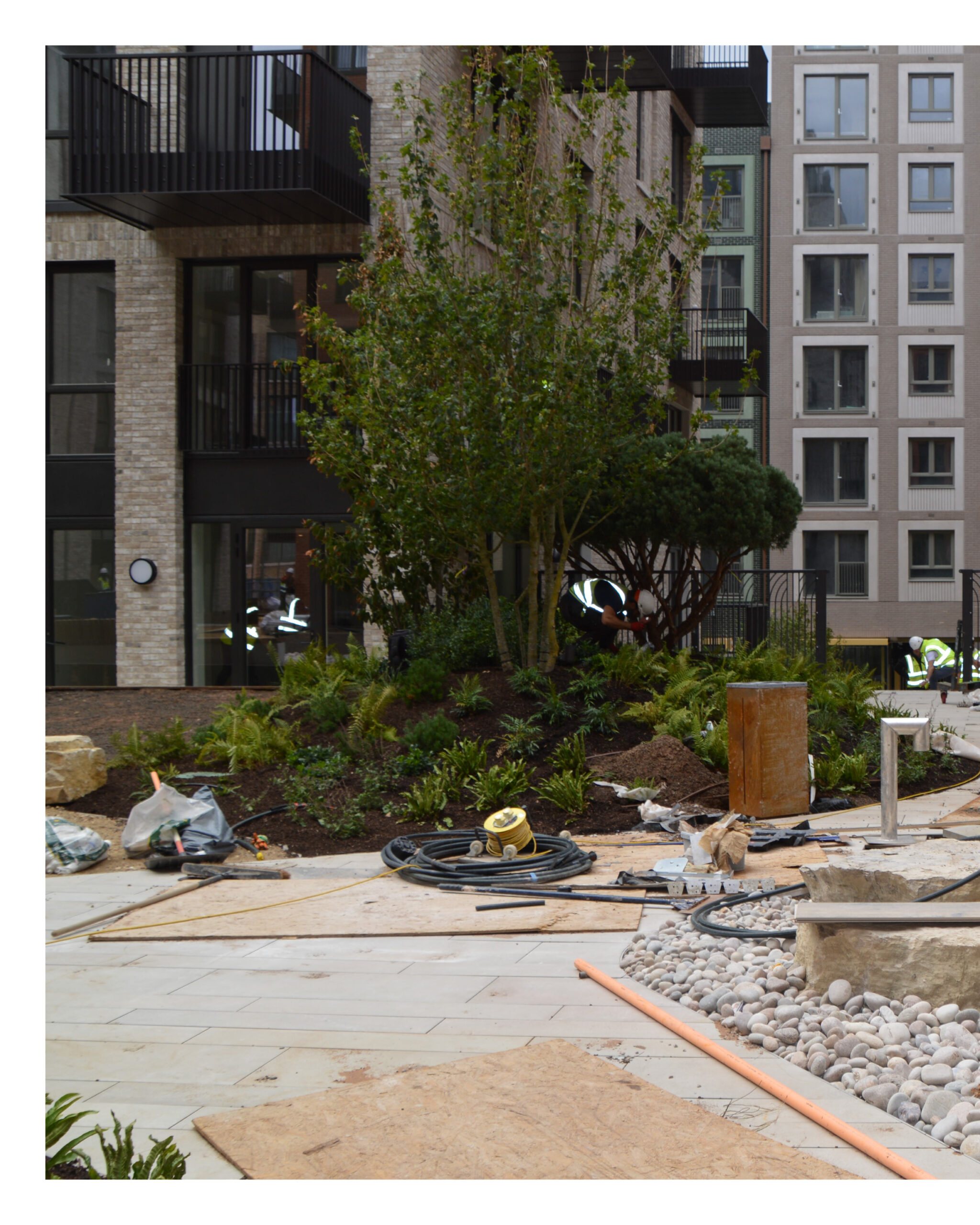 Allen Pyke Associates were appointed by Galliford Try as part of their design and build team to develop the project to construction stage. The proposals included a podium landscape, with access stairs and an amenity upper-level roof garden. The proposals have been developed to meet Part B of the Building Regulations (Fire safety). A blue roof was introduced over the podium slab as well as an automatic irrigation system. The seating and boulders formed part of the play strategy which was coordinated with Rospa. The proposals involved extensive coordination and collaboration with Argent’s planning stage landscape architect, Andy Sturgeon, to ensure the intent was realised. The proposals also included bespoke bug hotels, seating and a dry riverbed that meanders through the main podium.